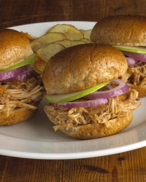For sauce: Whisk together applesauce, preserves, chili powder and vinegar to make BBQ sauce. Toss sauce with pulled pork. Fill each slider bun with about 1/4 cup pork, apple slices and red onion slices. Serves 6