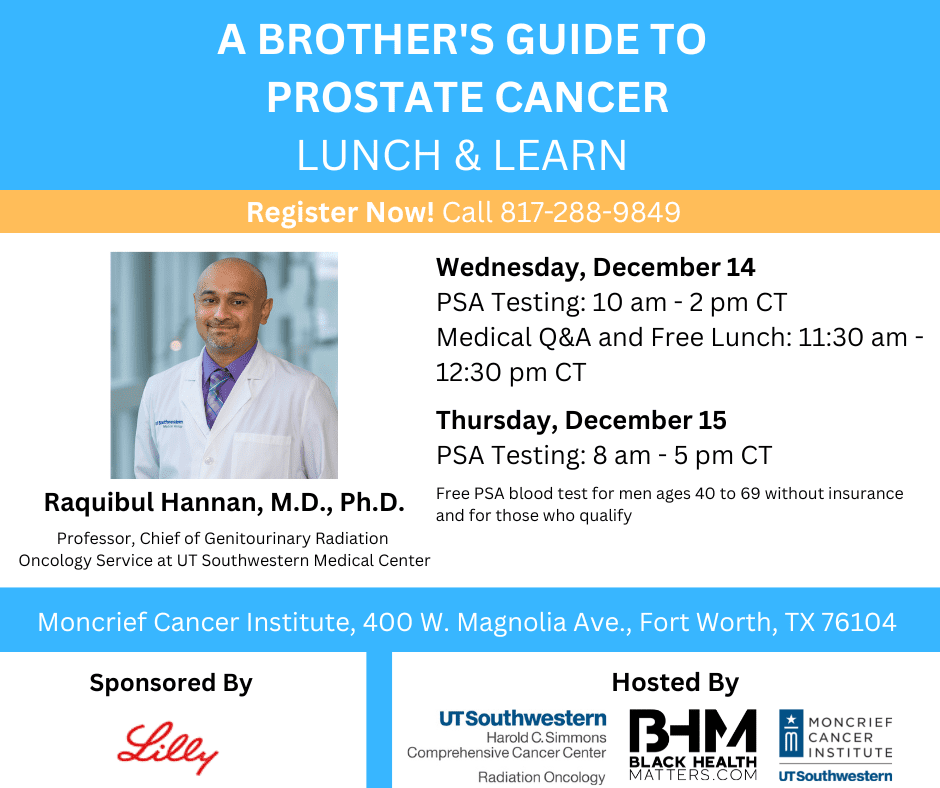 Join us for our lunch & learn on prostate cancer by calling 817-288-9849 to register. Free lunch will be available as we discuss powerful and valuable insights on prostate cancer and its higher impact on the African American community. Free PSA blood tests will also be available for men ages 40 to 69 without insurance and for those who qualify.