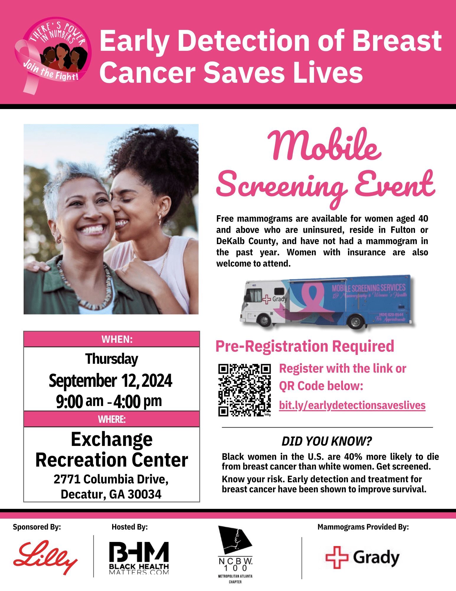 Black Health Matters in partnership with the National Coalition of 100 Black Women, Inc. – Metropolitan Atlanta Chapter, invites you to join us for a day of FREE Mammogram Screenings!