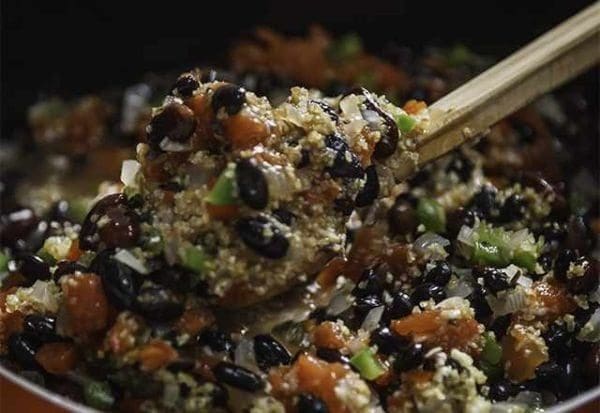 Try this quick, zesty vegetarian chili packed with bell peppers, bulgur wheat, beans, tomatoes and spices. The bulgur wheat looks like ground beef and adds a lot of fiber. As a result, this healthy vegetarian chili looks a lot like traditional chili.