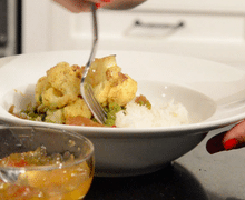 You want a quickie meal that’s made in one pan—but you’re so over stir-fry. My curried cauliflower just might do the trick. Bright and full of yummy Indian-inspired flavors, it makes a delightful weeknight meal. Plus, it’s vegetarian. And if you buy all the pre-chopped veggies, the preparation is a breeze.