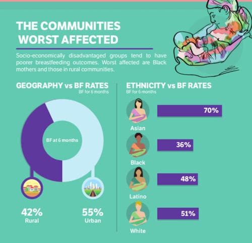 Studies indicated that rather than being caused by some inherent urban or rural culture, it has far more to do with confounding factors, such as maternal ethnicity and poverty level. Mothers living in rural communities are more likely to have a lower income and work in a job that doesn’t allow as maternity leave and doesn’t provide a lactation programme. They are also less likely to receive social breastfeeding support.
